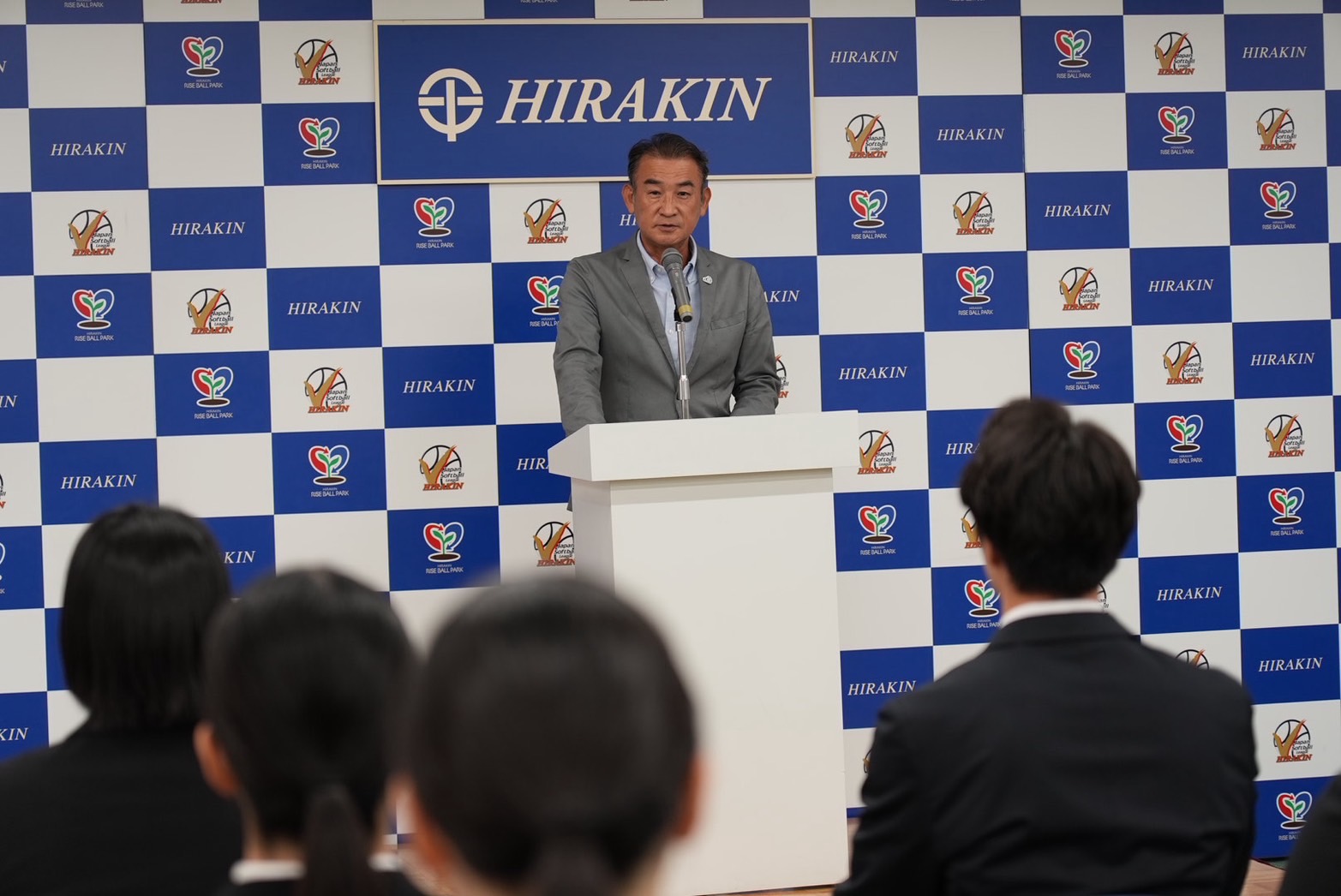 式では内定通知書の授与、社長祝辞、先輩社員から歓迎のあいさつが行われました。