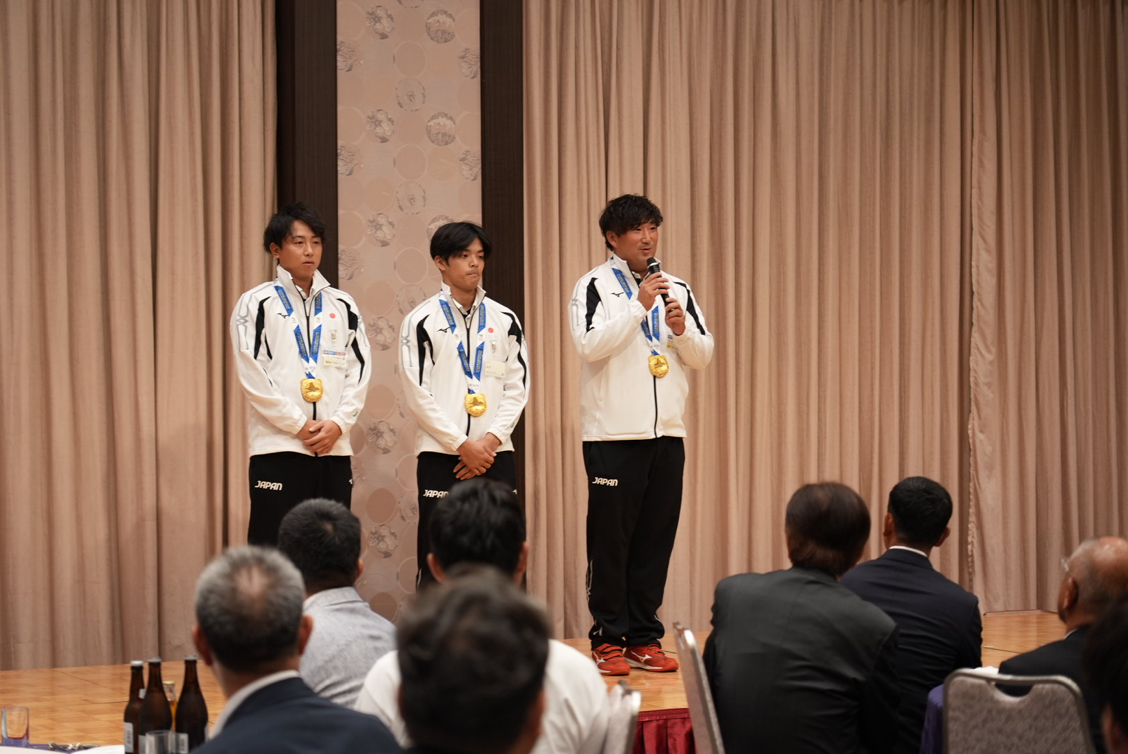 また、懇親会では男子ソフトボール日本代表の鳥山選手、浜本選手、八角選手より、ワールドゲームズ金メダル獲得の報告をさせていただきました。