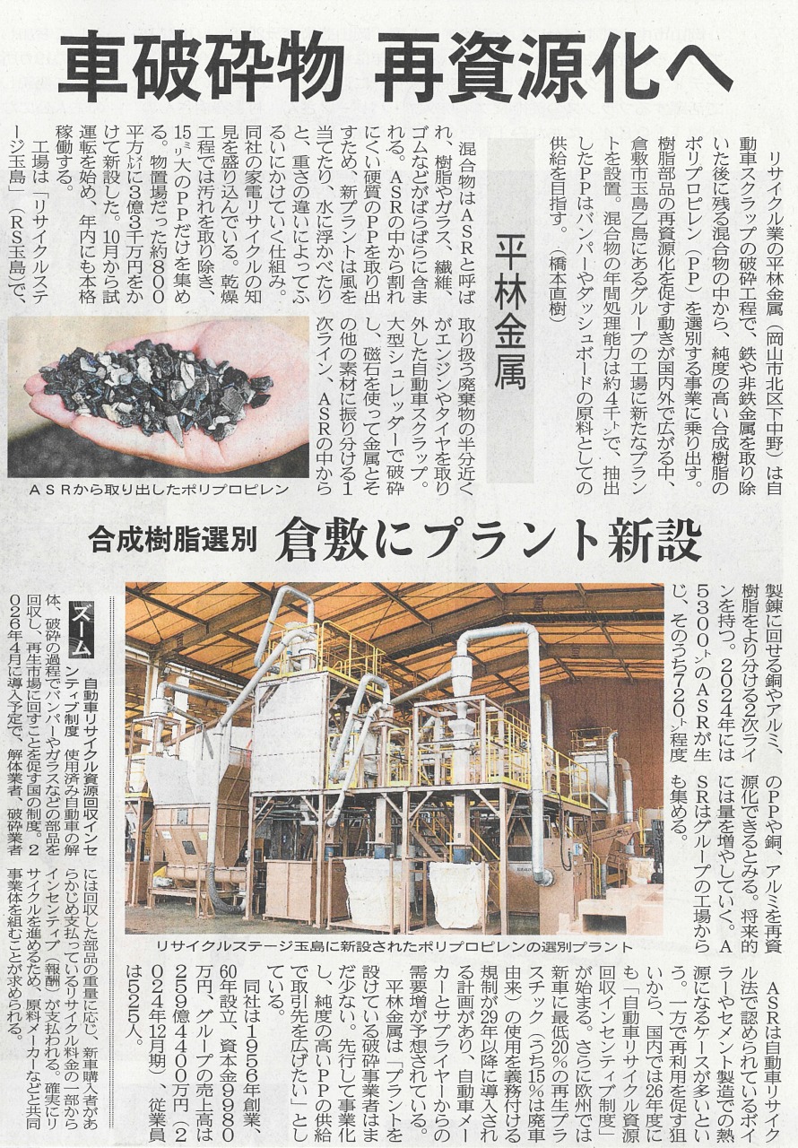 2025年10月17日の山陽新聞朝刊にリサイクルステージ玉島に新設したミックスプラスチック選別プラントの記事が掲載されました。