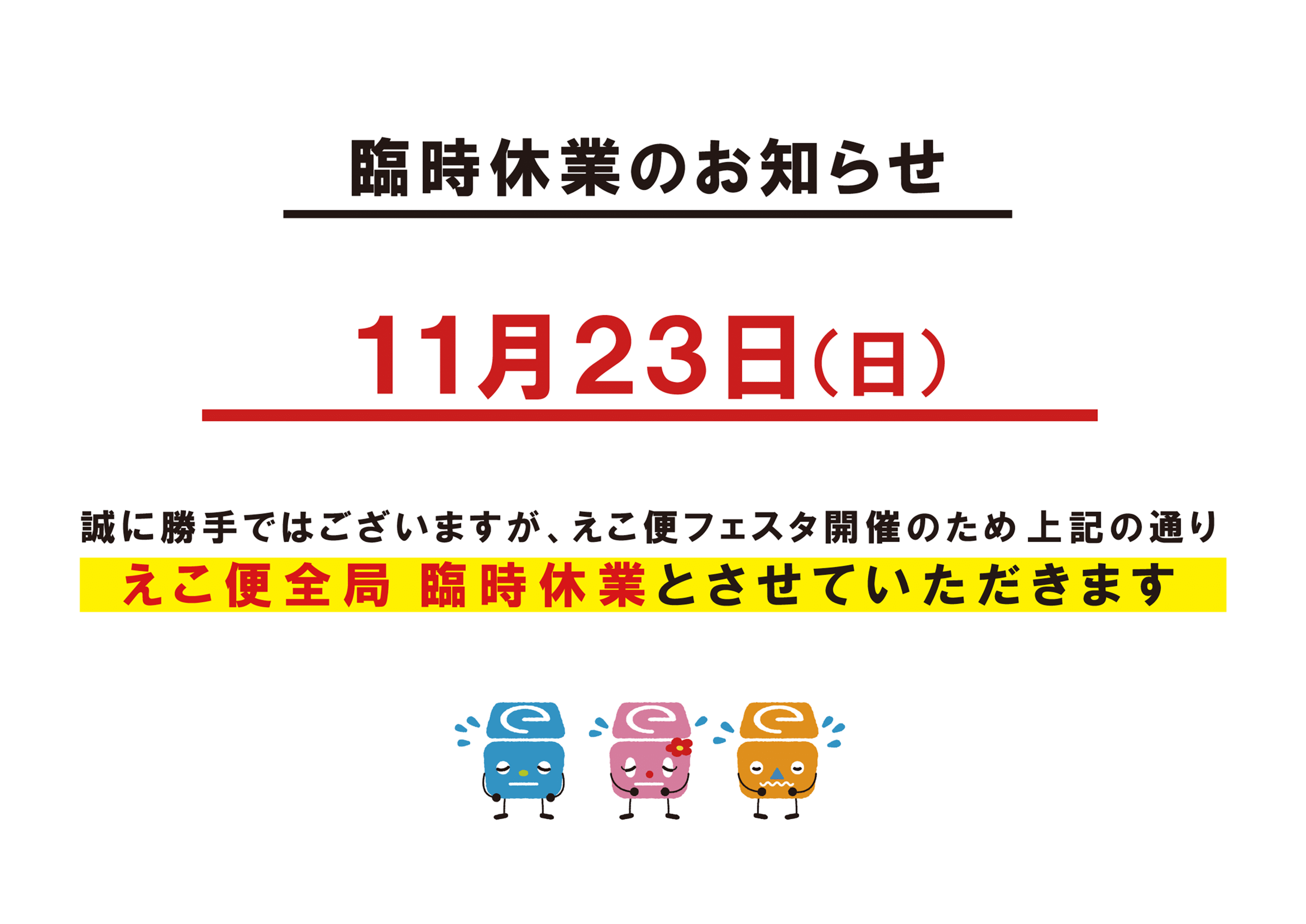 誠に勝手ではございますが、えこ便フェスタ開催のため、えこ便全局を臨時休業とさせていただきます。