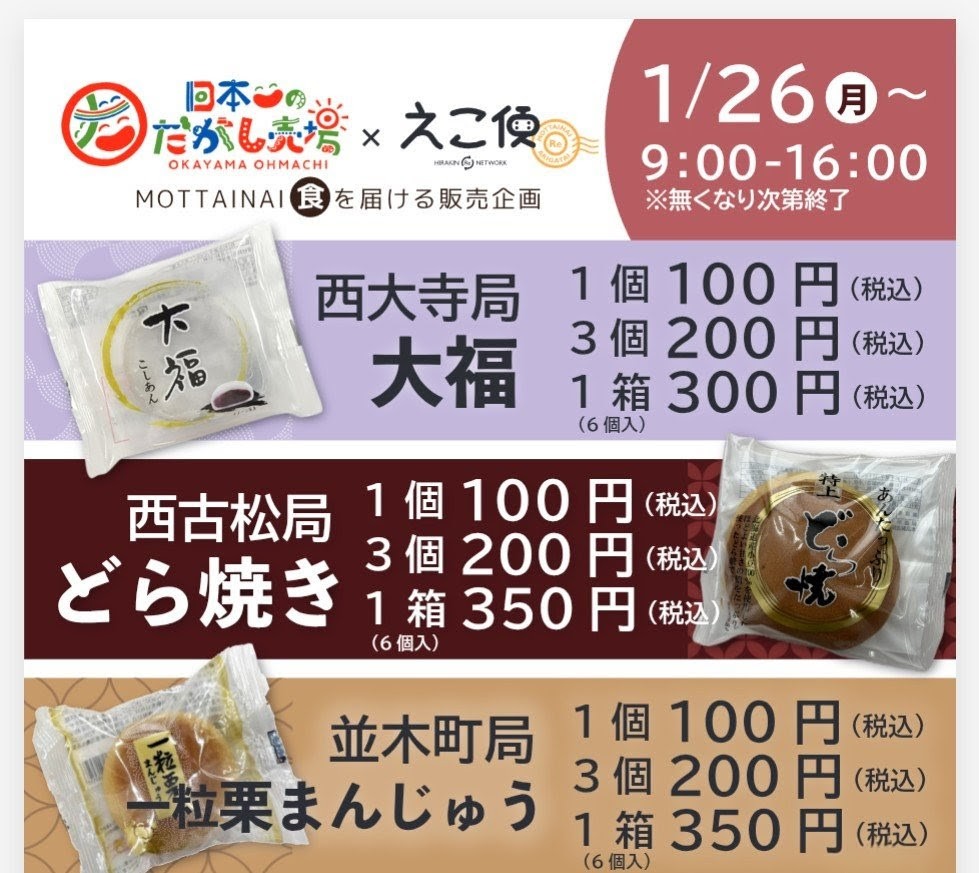 1月26日(月)より、「日本一のだがし売場」(株式会社大町様)と「えこ便」のコラボ企画で岡山のえこ便4局にてお菓子を販売します。