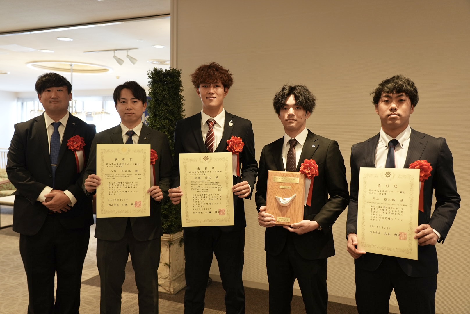 男子ソフトボール部 鳥山選手、八角選手、浜本選手、井上選手、陸上競技部 佐藤選手が表彰されました。