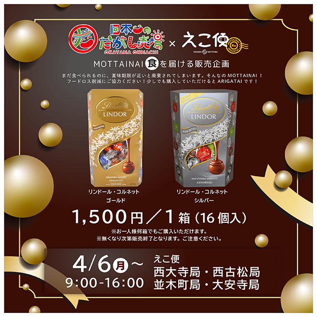 4月6日(月)から、「日本一のだがし売場」(株式会社大町様)と「えこ便」のMOTTAINAI「食」を届ける大好評の販売企画を、えこ便 にて実施します。