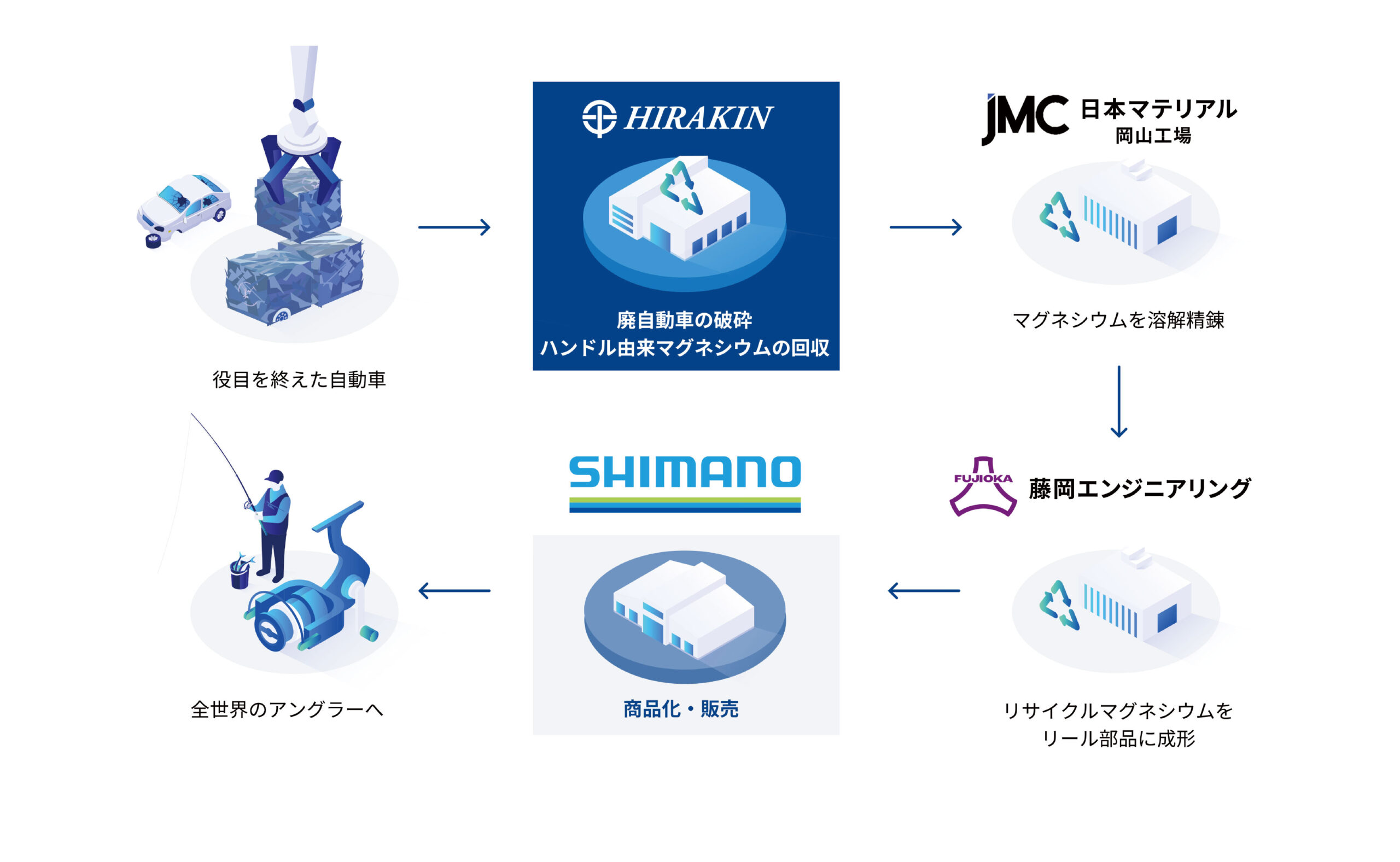 このたび、当社は、株式会社シマノ、日本マテリアル株式会社、藤岡エンジニアリング株式会社の4社共同で、自動車ハンドルに使用されていたマグネシウムを高品質な原料へ再生し、新たな製品へと活用する「グリーンマグネシウムプロジェクト」を始動しました。