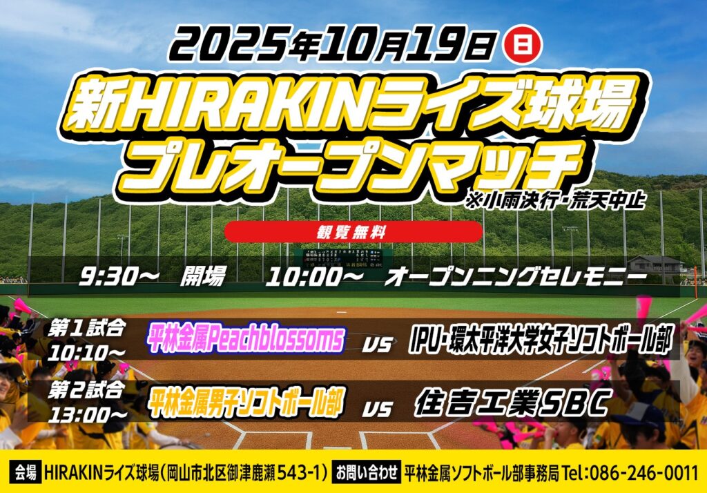 ・会 場:HIRAKINライズ球場(岡山市北区御津鹿瀬543-1)