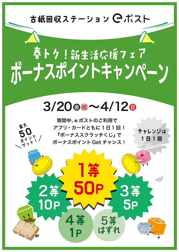 キャンペーン期間中、eポストをご利用いただくと、アプリ・カードともに最大100ポイントが当たるボーナススクラッチくじにご参加いただけます。