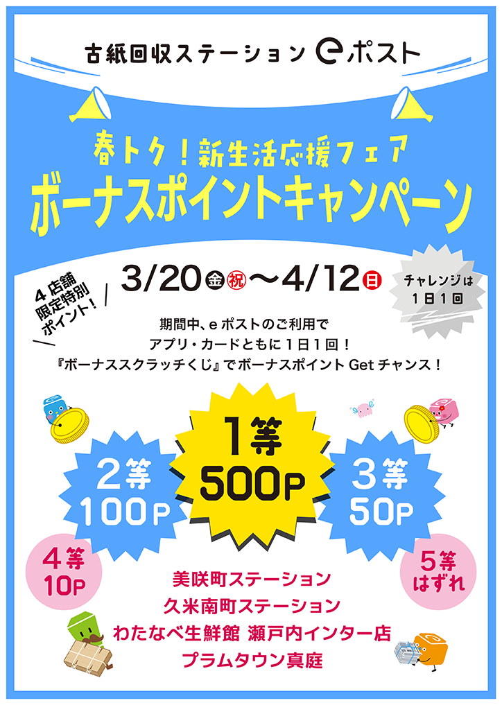 キャンペーン期間中、eポストをご利用いただくと、アプリ・カードともに最大100ポイントが当たるボーナススクラッチくじにご参加いただけます。