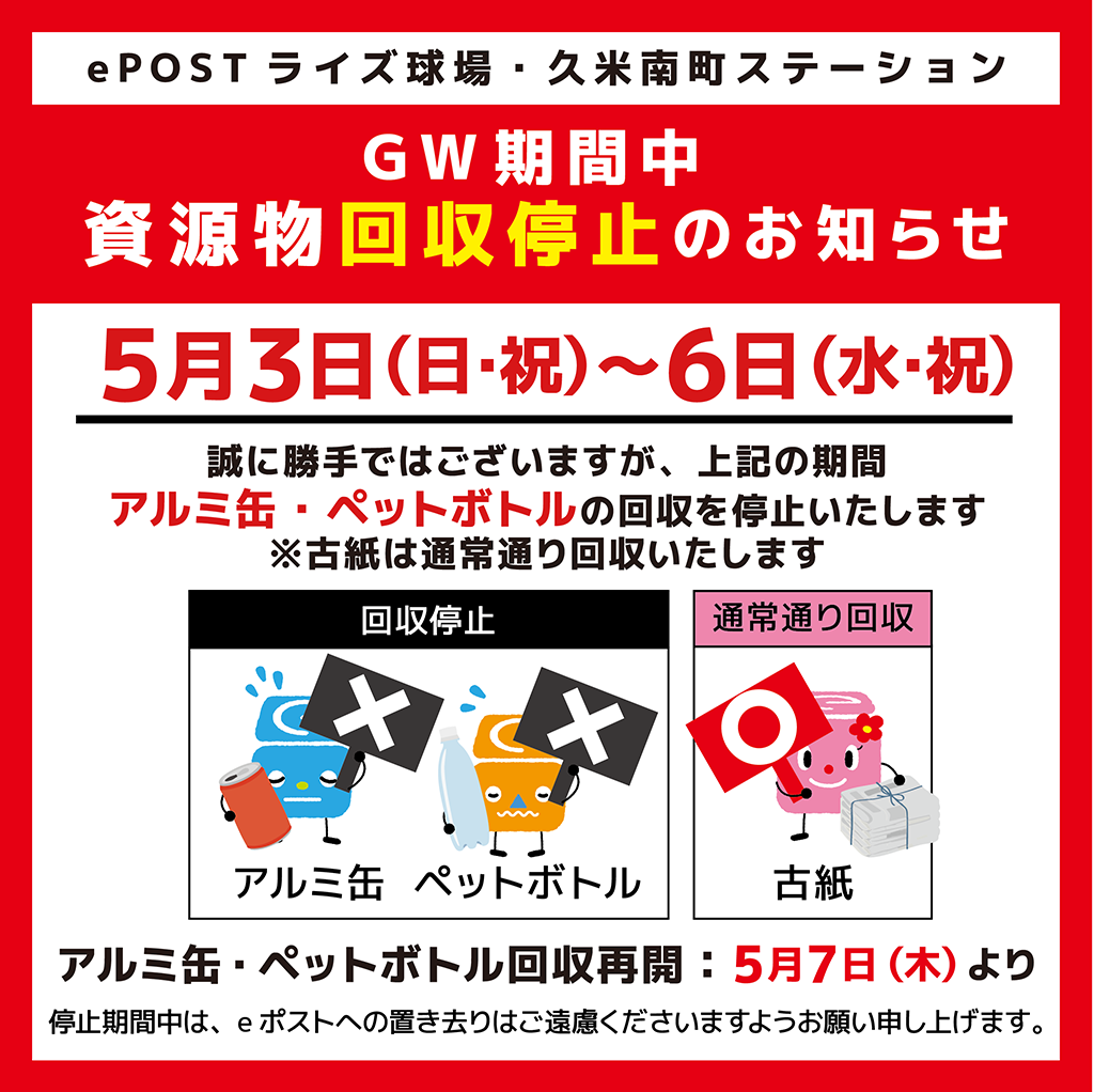 【ライズ球場・久米南町ステーション】資源物回収停止のお知らせ